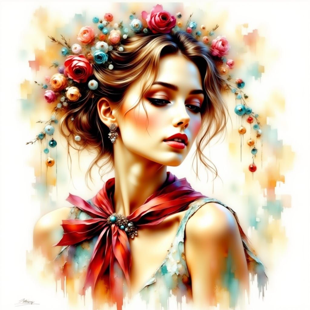 This image shows a modern woman in the style of impressionist art. She wears a soft red dress with plum accents and turquoise jewelry, standing in summer rain with a nostalgic and ethereal atmosphere.