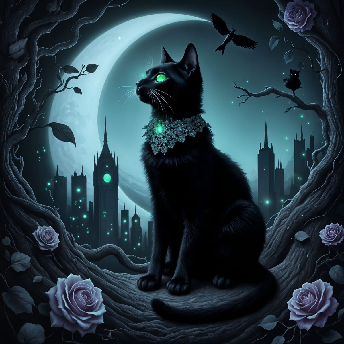A gothic image of a black cat with glowing eyes sitting on a crescent moon overlooking a city. This dark fantasy illustration uses dramatic lighting and a deep blue, purple, and black color palette.