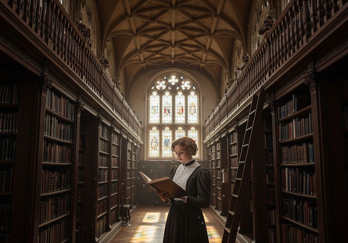 This image depicts a grand Victorian university library interior. Sunlight streams through stained-glass windows, illuminating a young woman engrossed in a book between towering bookshelves.