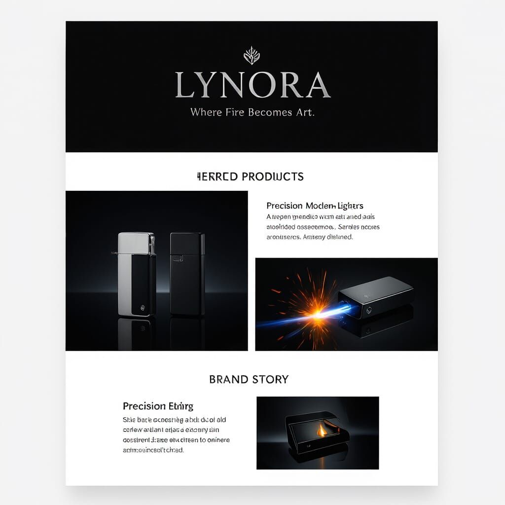 This image showcases a cinematic and luxurious LYNORA homepage design featuring a dark black background, silver typography, and a subtle metallic glow. It highlights elegant lighters and brand elements.