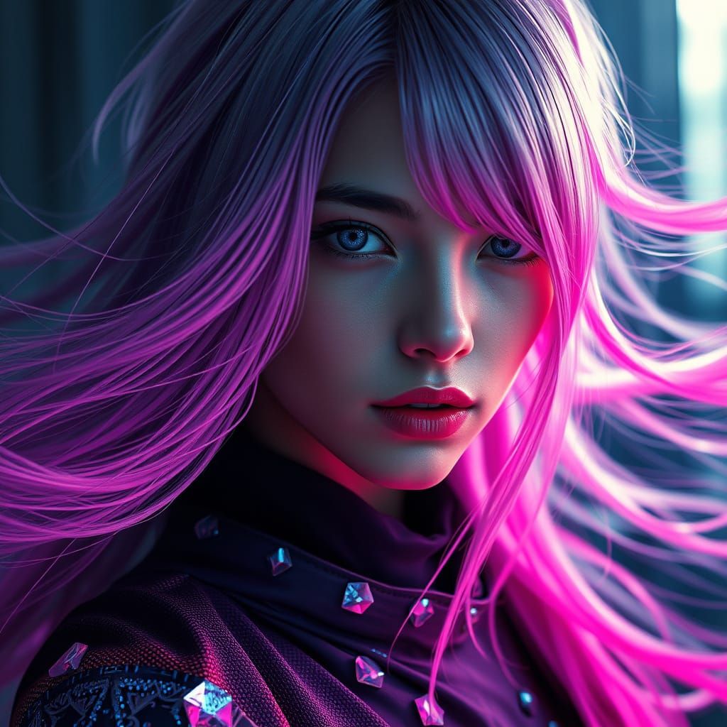 This image shows a hyper-realistic portrait of a futuristic woman with glowing gray eyes and vibrant neon hair. Rendered with cinematic depth and intricate details, showcasing flowing holographic textures and high contrast.