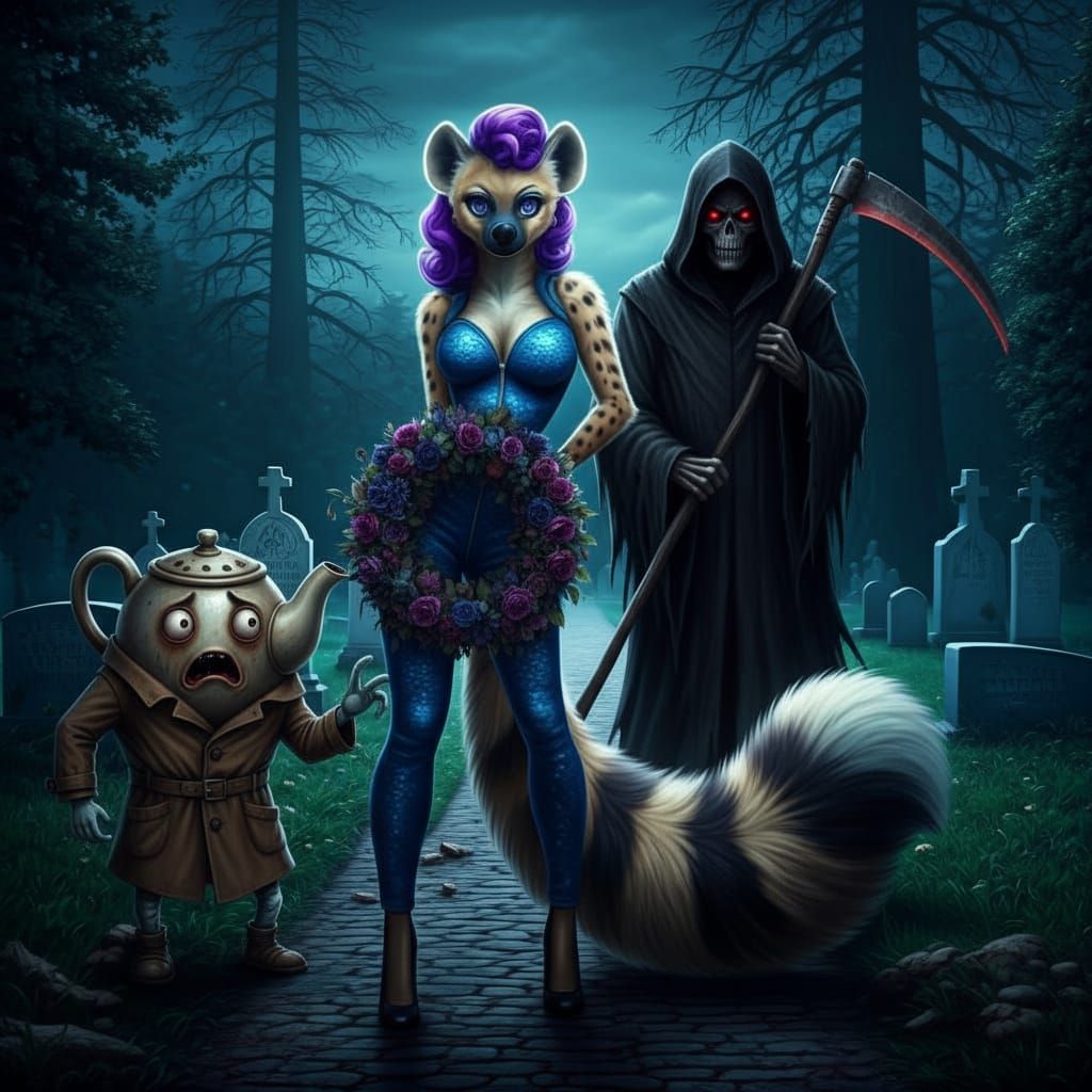 A terrified anthropomorphic teapot wearing a trench coat in a cemetery beside a purple-haired anthropomorphic she-hyena carrying a flower wreath. They face off against the Grim Reaper.