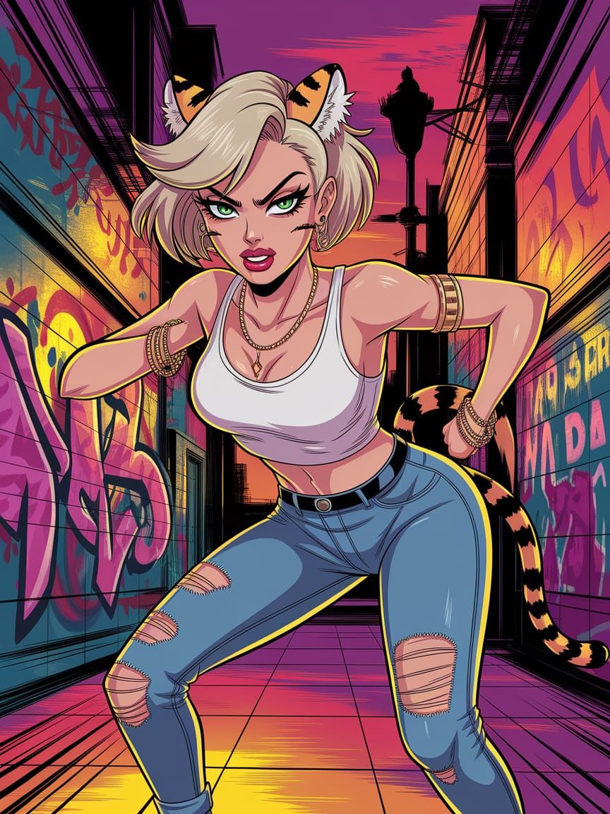 This image shows a Korean woman with tiger ears dancing hip-hop in an urban setting. She is drawn in a cel-shaded shounen manga style, reminiscent of Studio Trigger, and dressed in K-pop fashion.