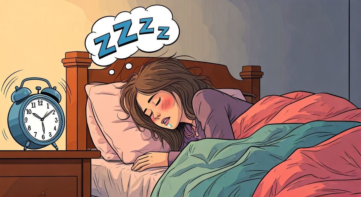 This image shows a sleeping woman in bed, surrounded by pillows. A vintage alarm clock rings loudly beside her, with comic book style ZZZ's floating above. The artwork has a halftone printing effect and polychromatic colors, in a classic comic book aesthetic.