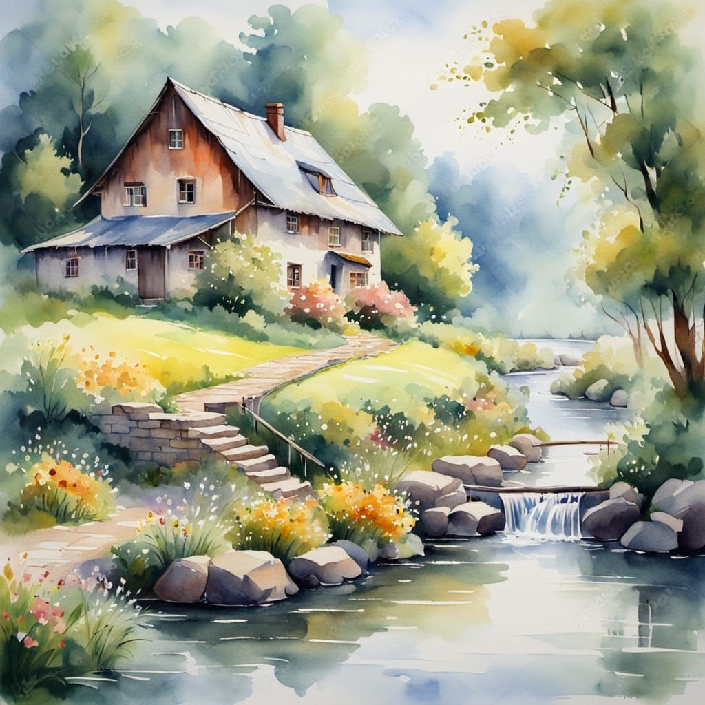 This image shows a village house by a stream in the countryside. The watercolor painting uses soft brushstrokes and a warm, pastel color palette to create a serene, impressionistic atmosphere.