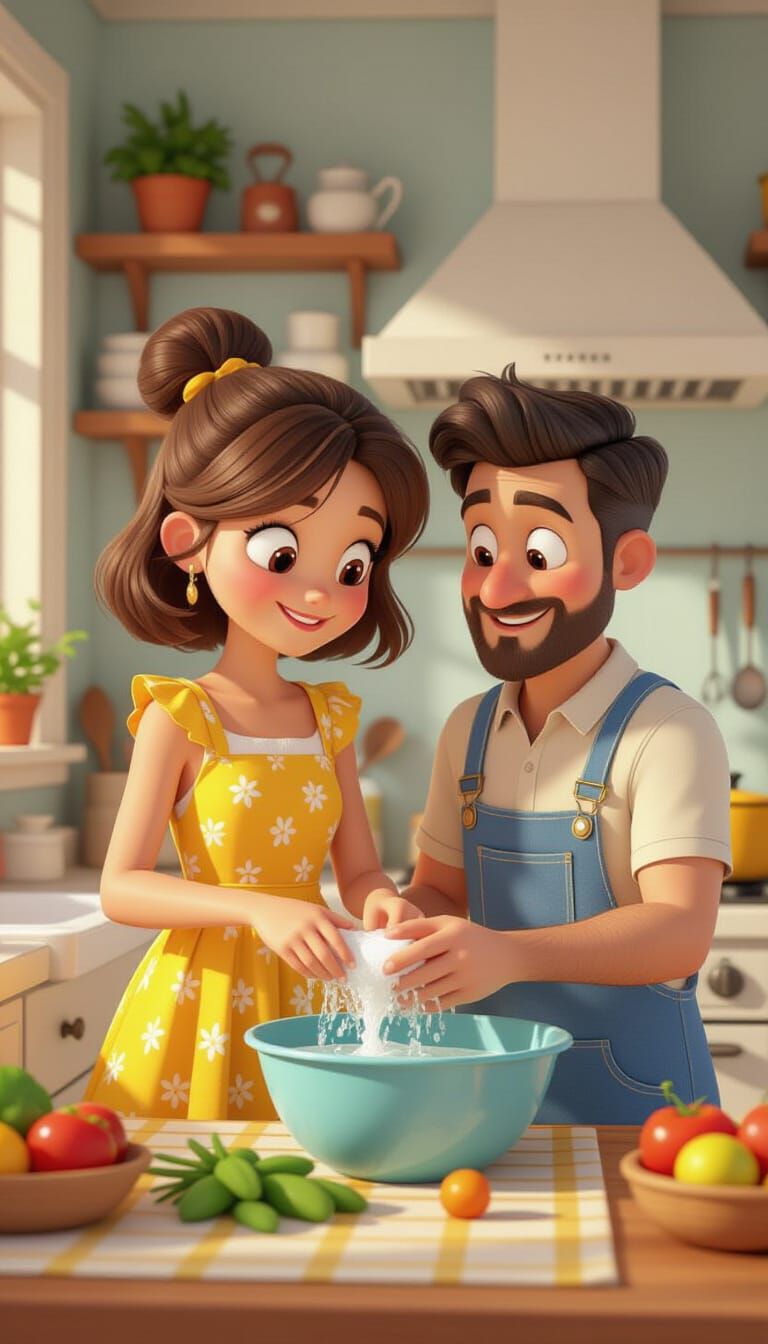 This image shows a 3D animated girl and her father washing vegetables in a colorful kitchen. The scene has a clean, stylized cartoon aesthetic, reminiscent of Pixar animation.