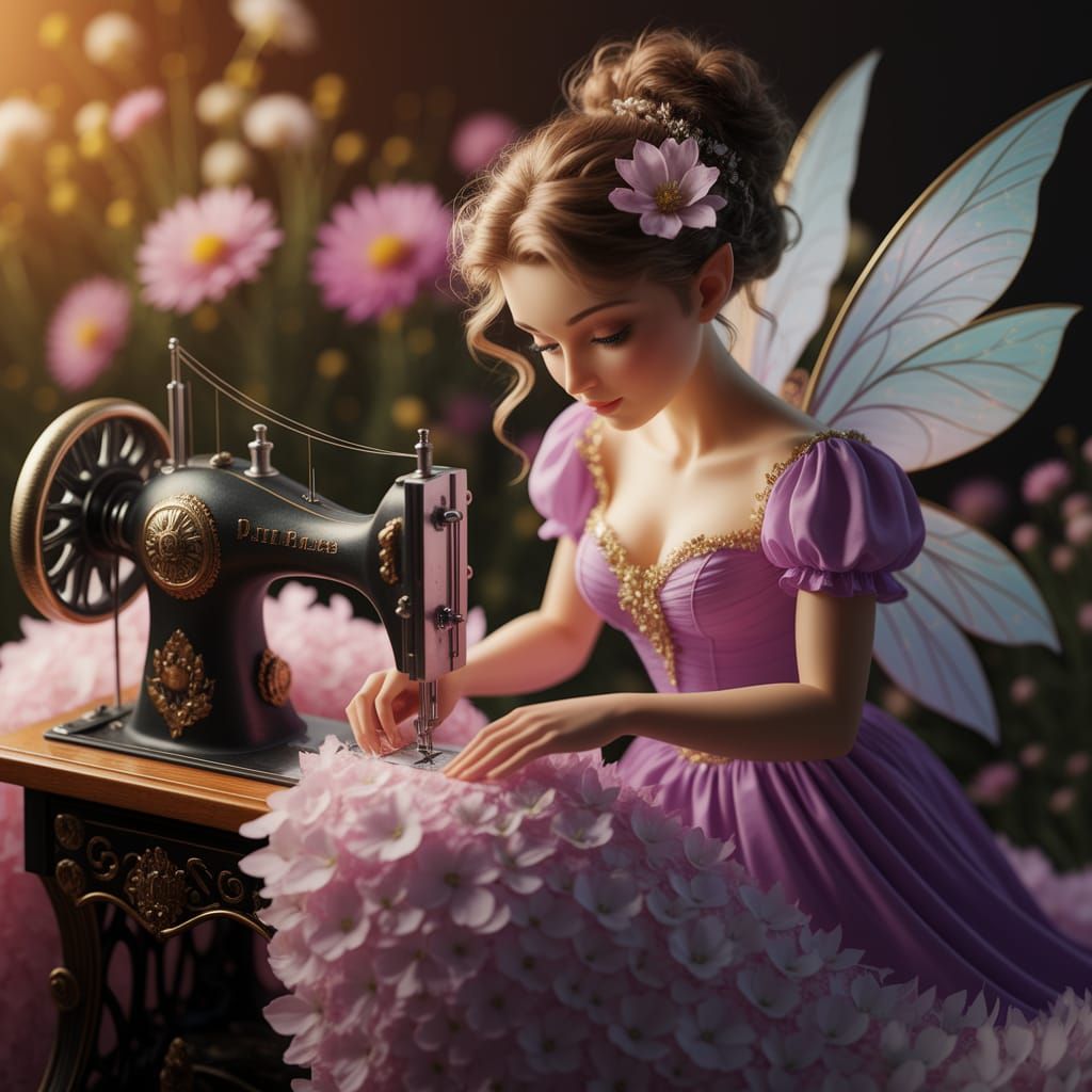 This enchanting digital art captures a fairy tailor sewing a dress from flower petals on a detailed wooden machine. Warm golden light enhances textures in this intimate mid-shot portrait.