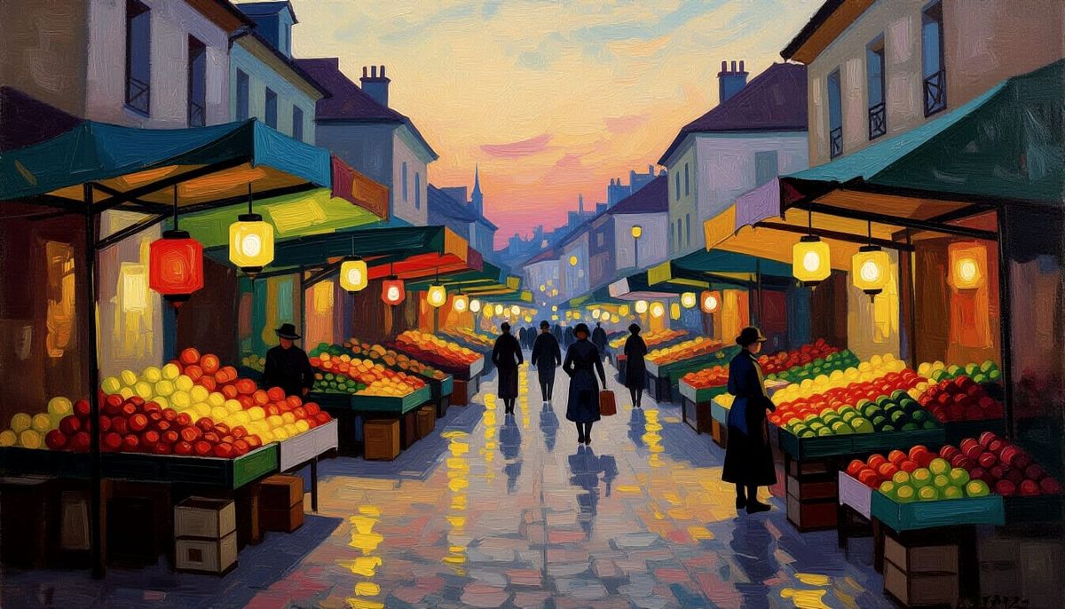 No-Theme Thursday. Impressionism. A bustling, vibrant street market at dusk, filled with stalls selling exotic fruits and glowing lanterns. ...