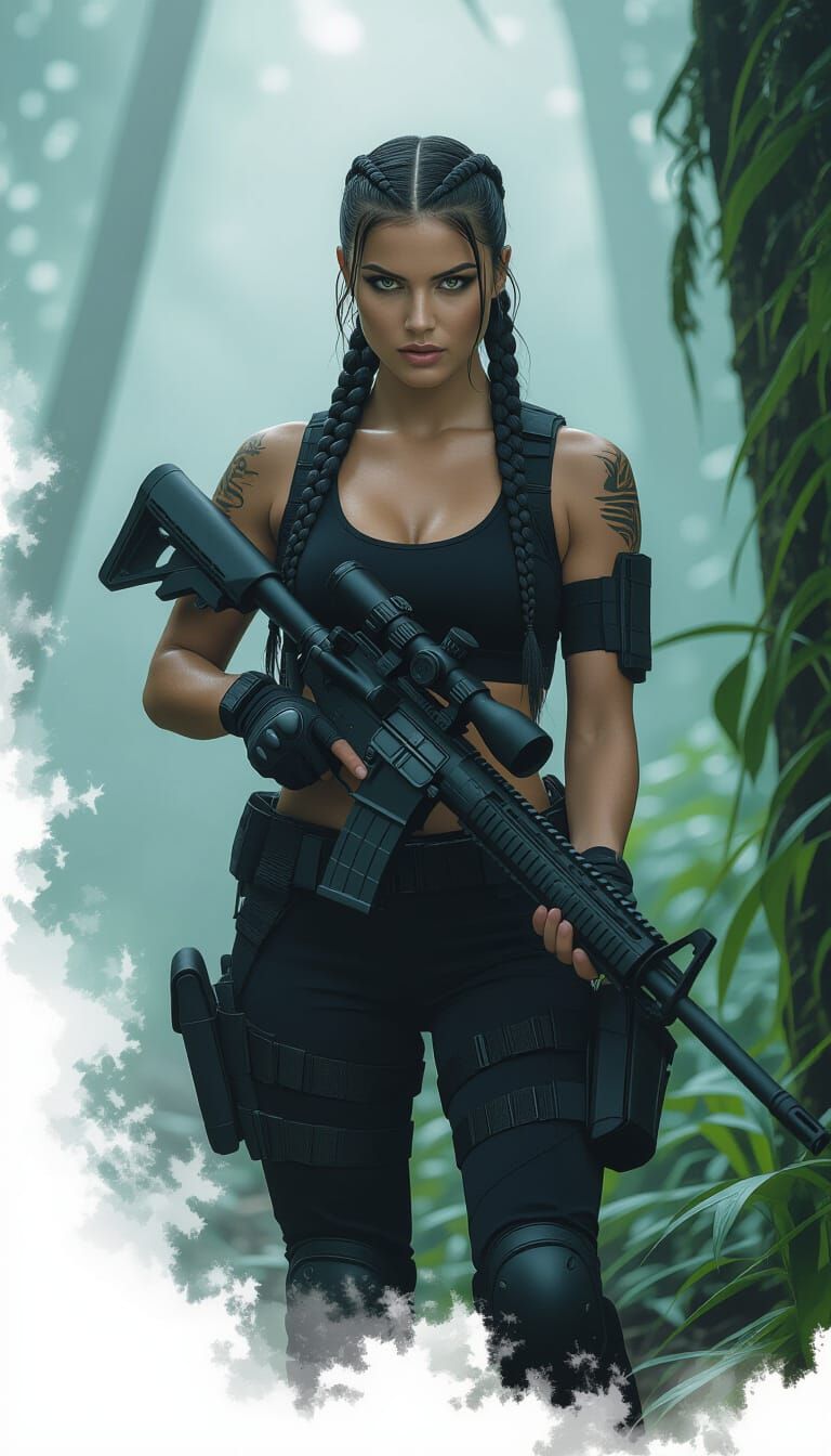 This image shows a female special operations soldier with braided hair and grey eyes in a foggy forest. She is holding a sniper rifle, wearing tactical gear, and rendered with dramatic cinematic lighting and film grain.