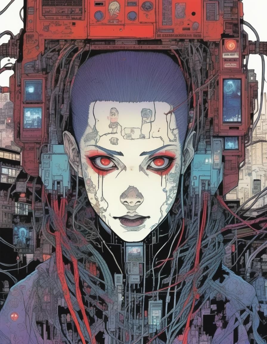 A striking portrait of a cyberpunk vampire immersed in a digital world. The image evokes a morbid yet sparkling aesthetic, reminiscent of manga art styles.