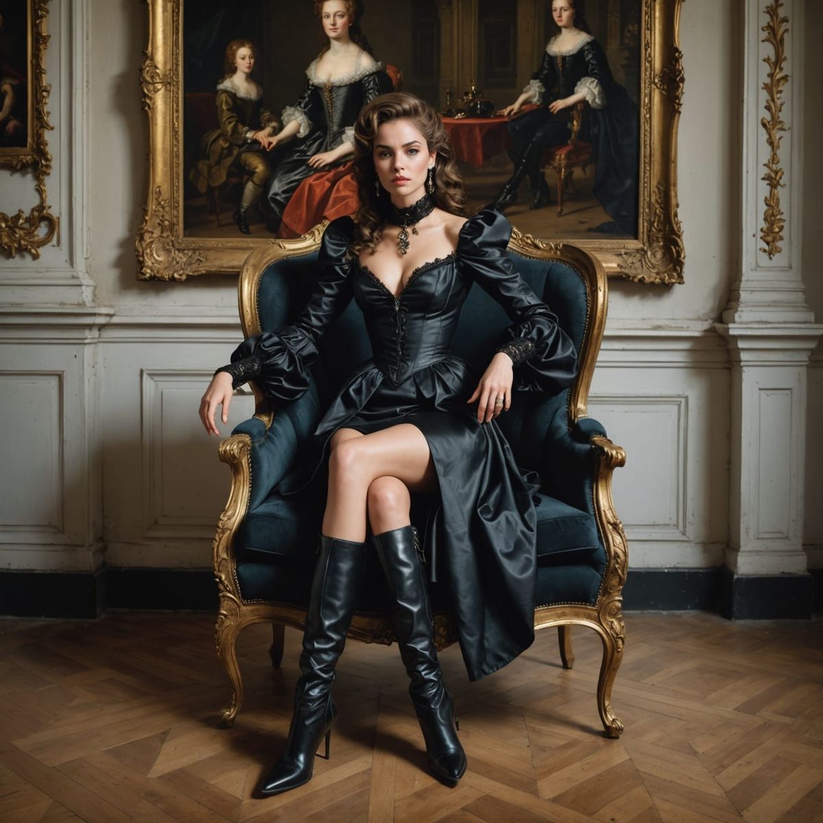 This image depicts a woman in high-heeled boots, holding a whip and seated in an armchair, with a baroque painting on the floor, rendered in a classical art style.