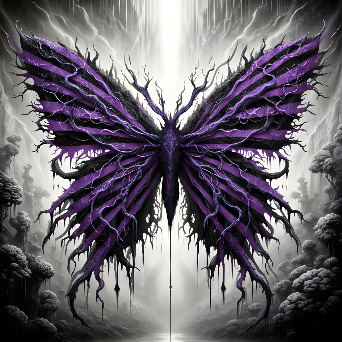 This image depicts a hyperdetailed, intricate grayscale butterfly with an eldritch and surreal filigree design. The artwork is rendered in a highly detailed, grayscale style.