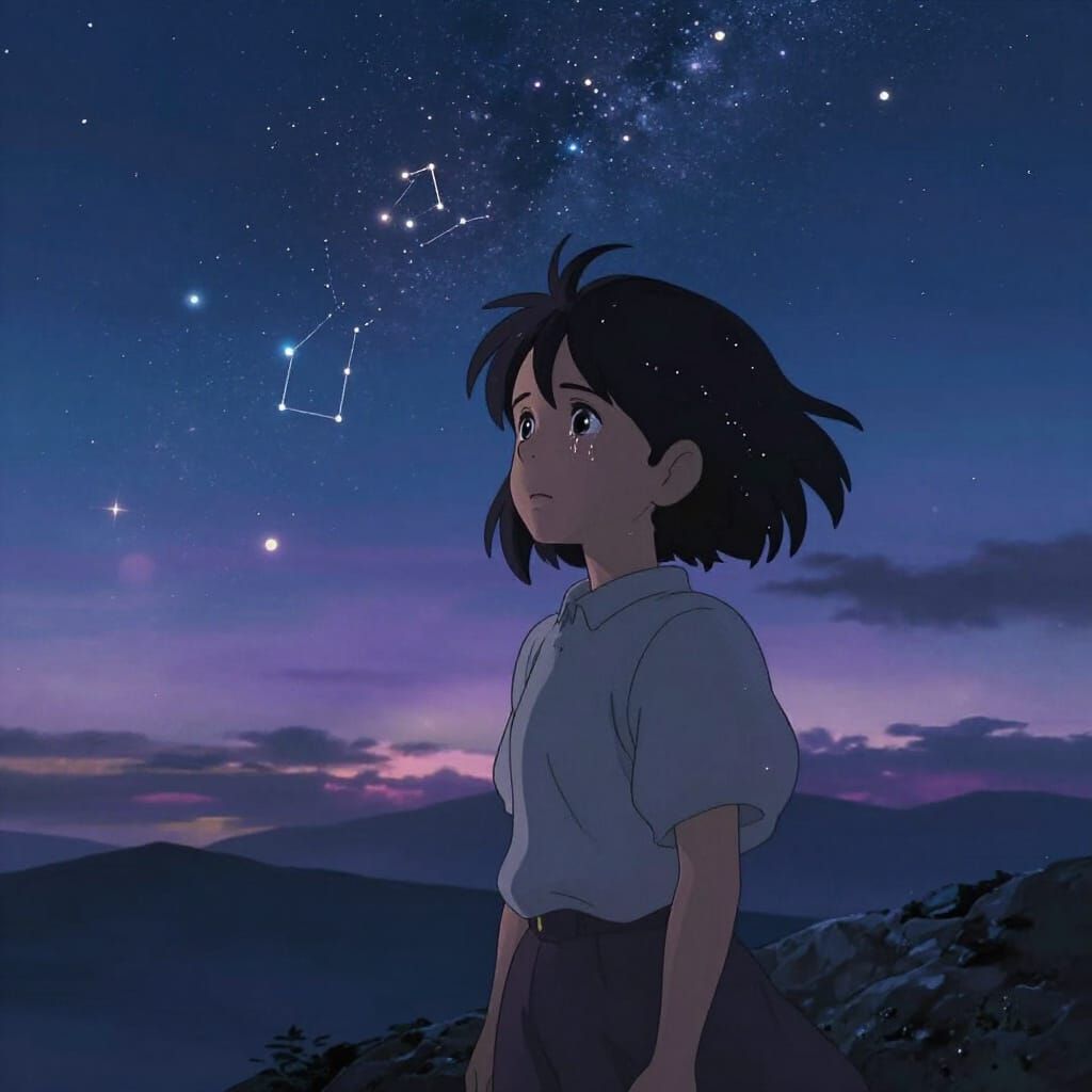 This image depicts a young girl on a mountain peak at night, her face reflecting the vast, star-filled sky. The scene captures a profound moment of solitude and inner awakening with luminous light and emotional depth, rendered in anime cinematic realism.