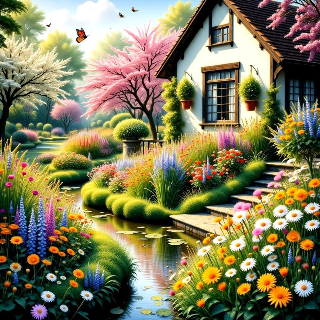 This image depicts a serene and beautiful spring garden scene, featuring lush flower beds, hanging baskets, and a tranquil pond, all set against a sunny sky with vibrant, hyper-detailed floral elements and soft, serene lighting.
