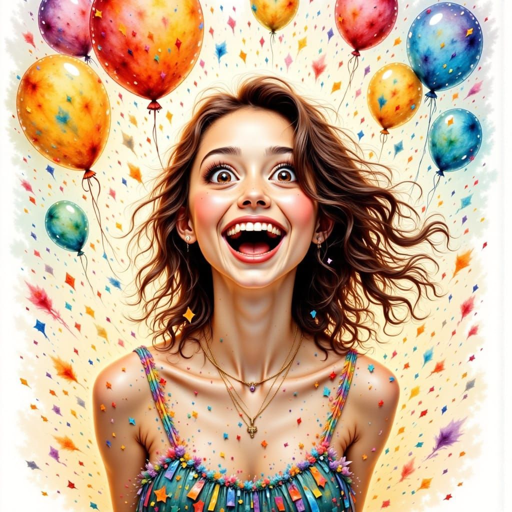 This watercolor painting captures a vibrant scene of a woman joyfully celebrating her birthday with colorful balloons and confetti. The art features loose brushstrokes and a bright, cheerful palette.
