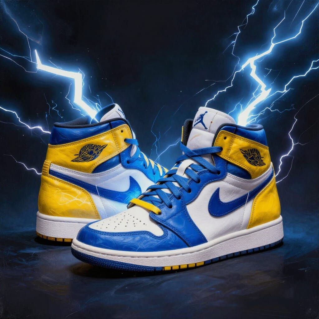 This hyperrealistic digital painting showcases iconic sneakers surrounded by vibrant blue and yellow lightning. The intense lighting and sharp focus emphasize the raw energy and shoe texture against a dark background.