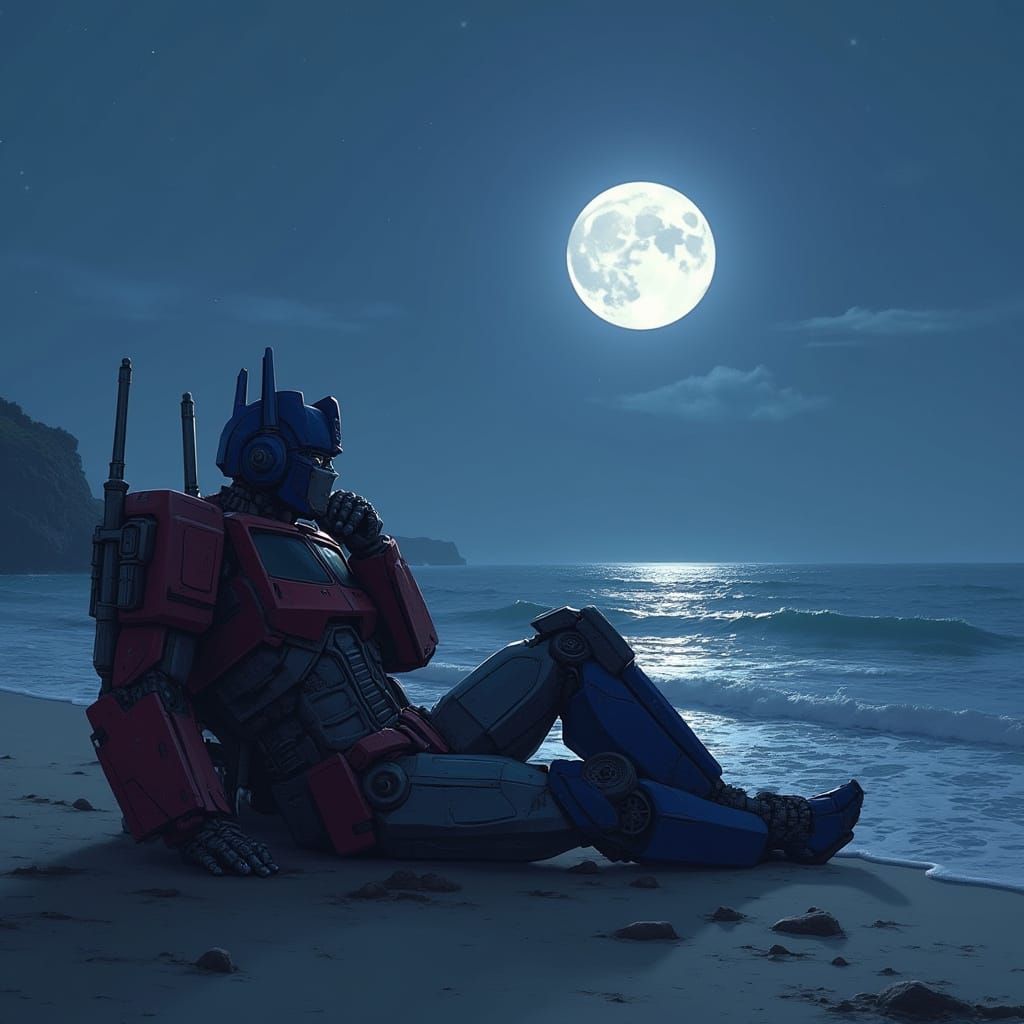 This image shows Optimus Prime in a reflective moment on a beach under moonlight. Gentle waves meet the shore in this cinematic and serene digital painting with atmospheric lighting.