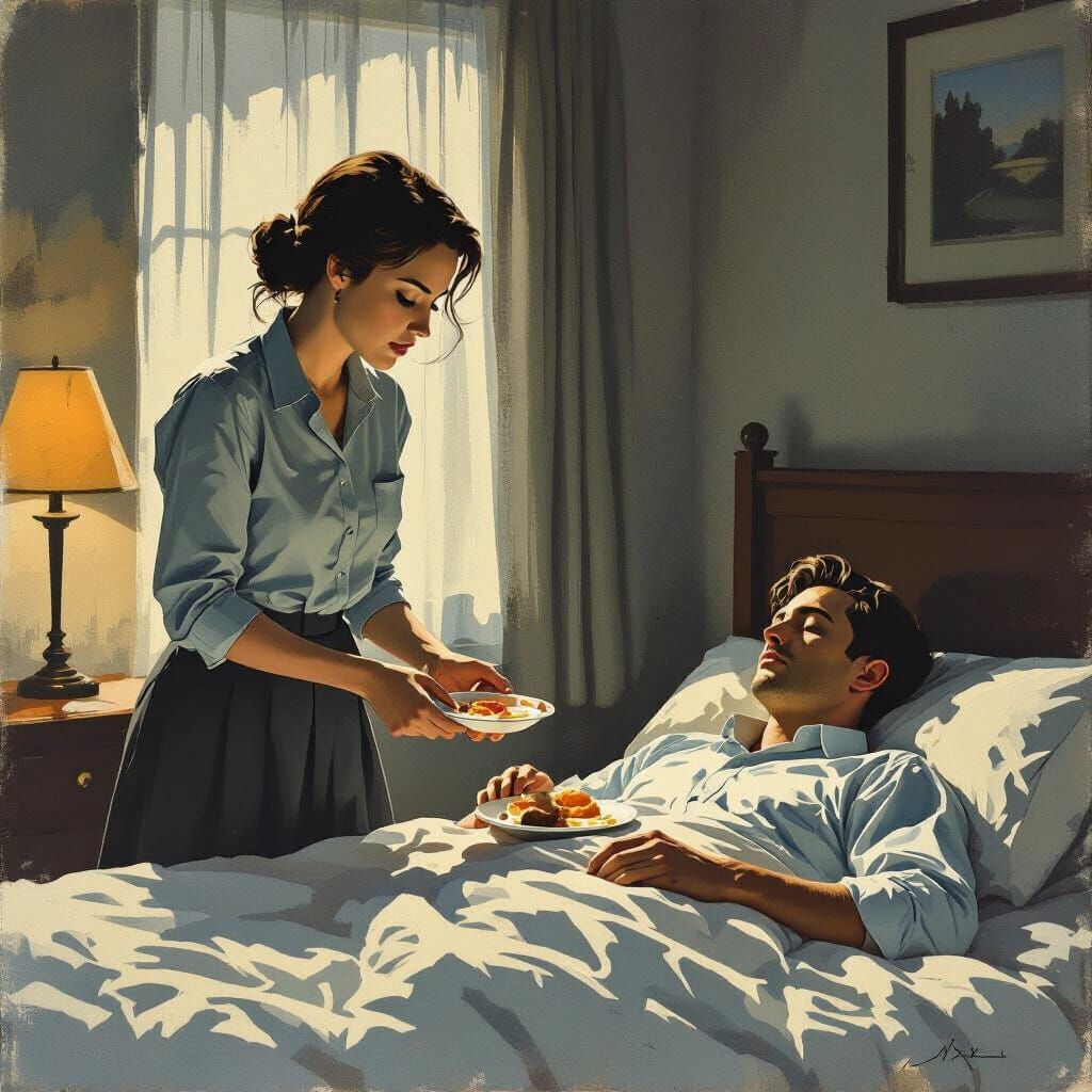 This image shows a woman serving breakfast to a silent man in bed. The scene is rendered in a film noir style with dramatic shadows and muted colors, evoking a sense of weariness and disconnection.