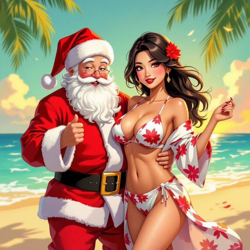 This comic art depicts a joyful scene of young Santa dancing with a woman on a beach. Golden hour lighting creates a warm, tropical atmosphere.