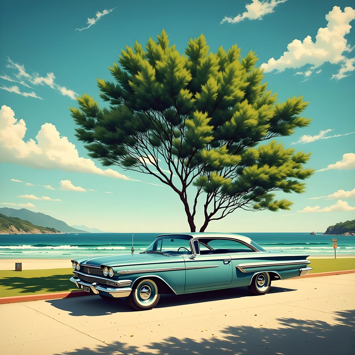 This image shows a classic 1960s American car parked on a serene beachside lot, surrounded by a large tree and gentle waves, in a beautiful antique watercolor style.