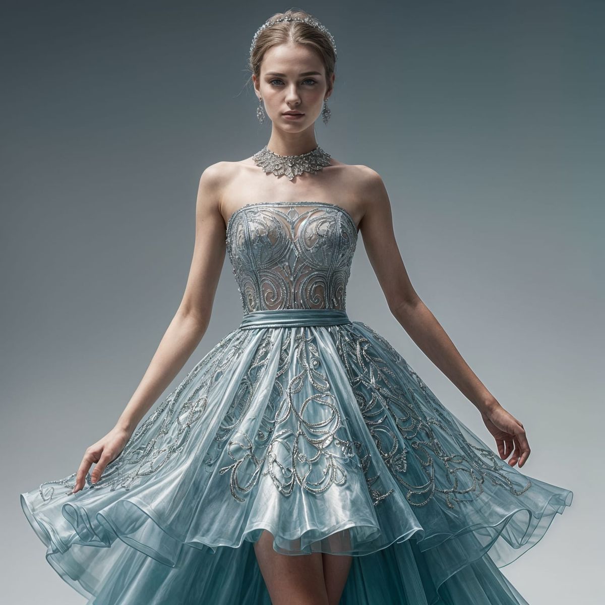 This hyperrealistic image depicts a beautiful woman in an intricately detailed setting, wearing an elaborate wide skirt made entirely of glass.