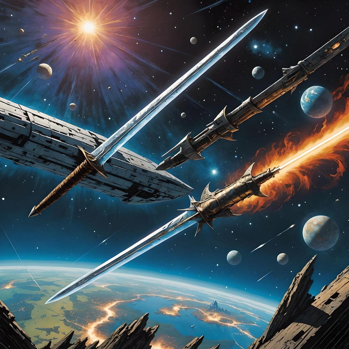 A colorful comic book illustration shows a Witcher's sword floating in space. In the background, a destroyed spaceship adds to the detailed and realistic scene.
