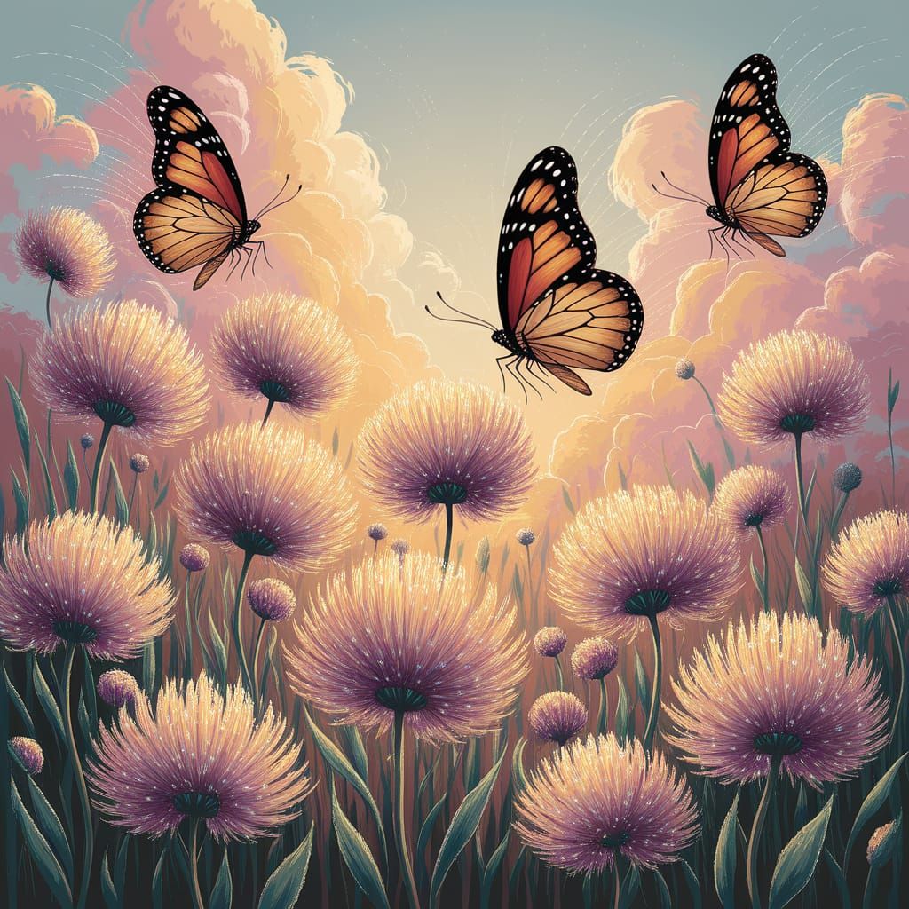 A vibrant picture of a flower field under golden light, rendered in an impressionist style. Butterflies flutter among soft clouds, their colors harmonizing with the flora in a detailed burst of hues.
