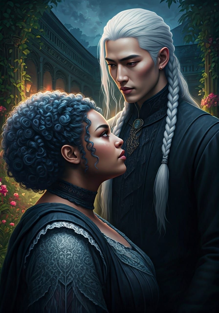 This image shows a striking portrait of a dark-skinned woman with blue hair. A young Asian man with braided white hair stands in the background in a surreal, hyperdetailed courtyard scene with volumetric lighting.