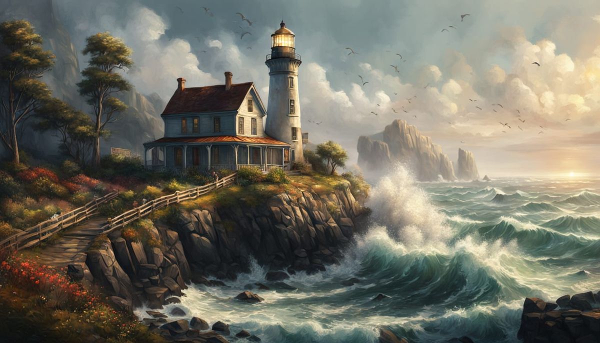 This image shows a vintage lighthouse battered by a rough sea, with waves crashing below. It features textured walls, an overgrown garden, and ethereal mist, rendered with a warm, rich palette and dappled sunlight.