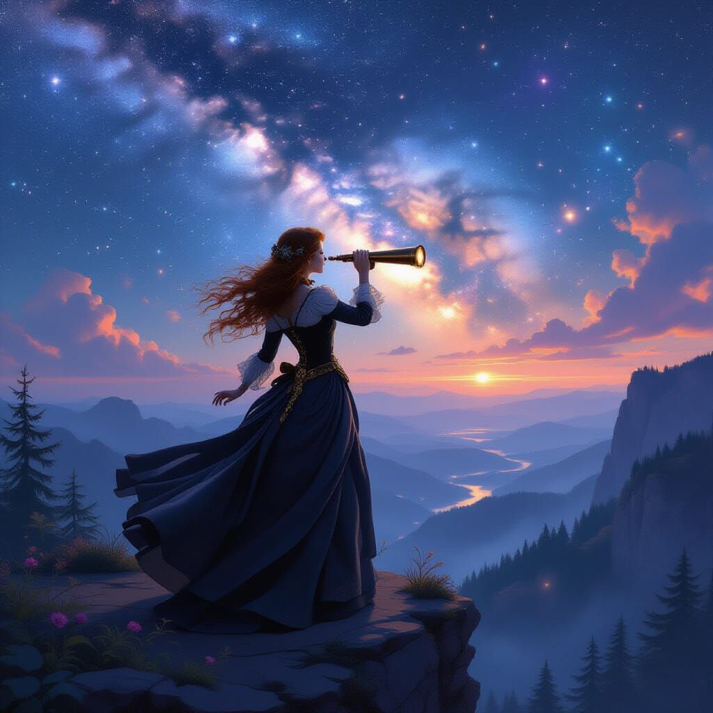 This image shows a woman in a vintage steampunk gown on a cliff, observing a vast nebula with a glowing telescope. The scene features ethereal cosmic light and deep colors, presented as a detailed matte painting.