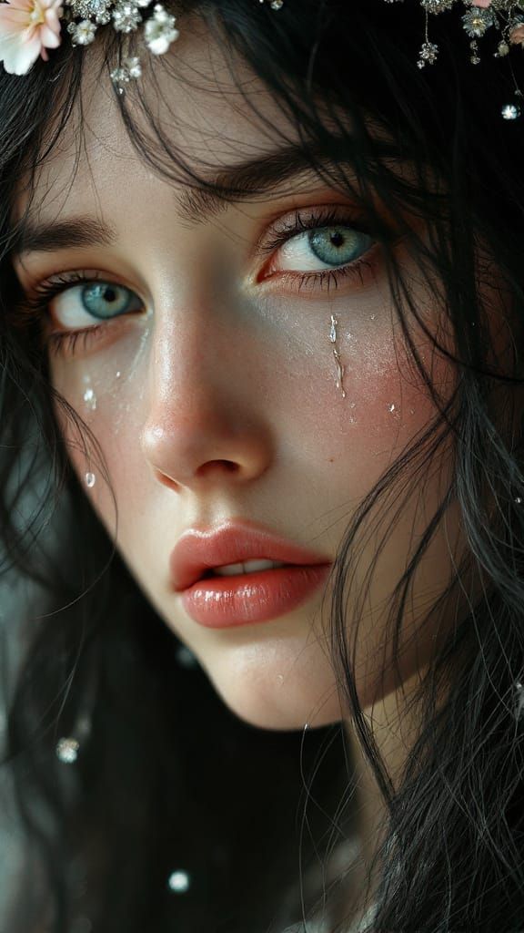 A close-up oil painting of a beautiful, ethereal princess with long black hair, porcelain skin, and tearful blue eyes. Flowers adorn her hair, and she wears a silver crown and sequin dress.