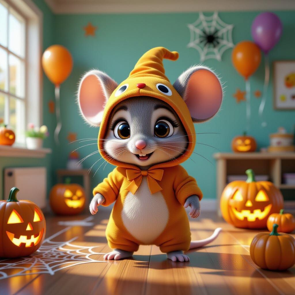 This image shows a baby mouse dressed in a Halloween costume standing in a kindergarten classroom. The room is festively decorated with Halloween decorations, rendered as 3D digital art.
