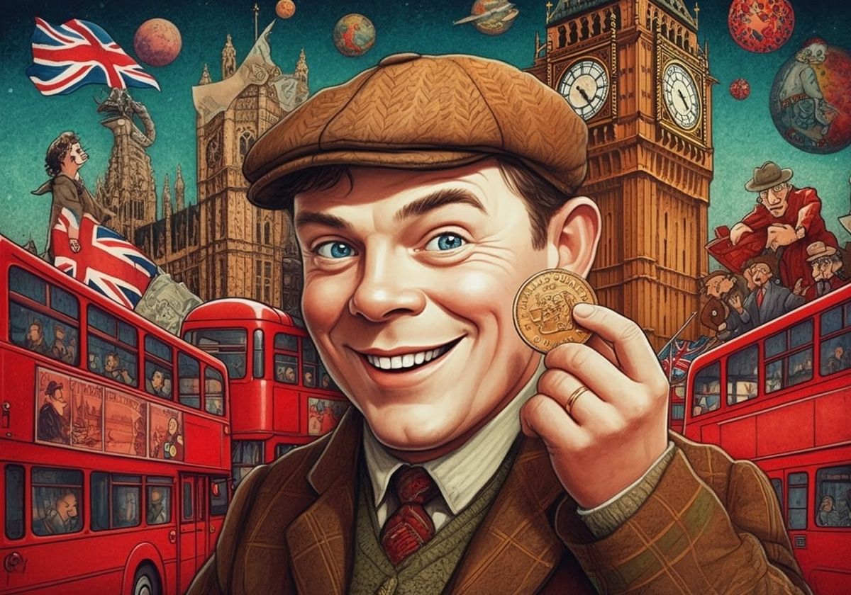 This image shows a charming character in a vibrant, surrealist London scene, blending iconic landmarks with playful doodles and bold colors, reminiscent of British folk art and avant-garde techniques.