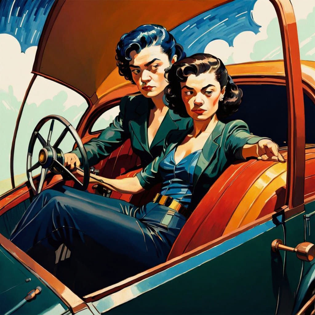 This image depicts two figures in a landscape, rendered with intense colors and deep dimensionality. The style evokes Van Gogh's expressive brushwork and vibrant palette, with a strong sense of light and shadow.