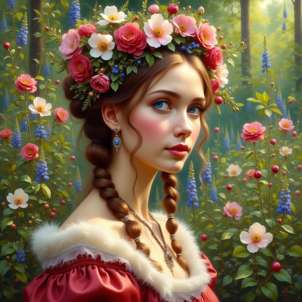 This image depicts a beautiful young woman in a lavish Russian-inspired outfit, surrounded by vibrant flowers in a royal garden, capturing the essence of a spring morning with photorealistic detail and golden proportions.