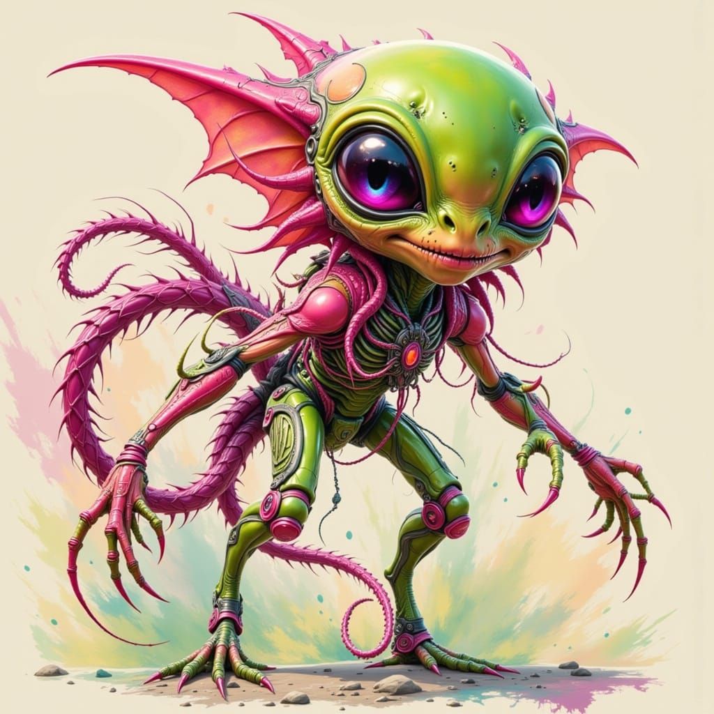 This image depicts a hyper-realistic, super detailed splash art of a voluptuous alien with three eyes and long legs, rendered in striking pink, green, and orange hues.
