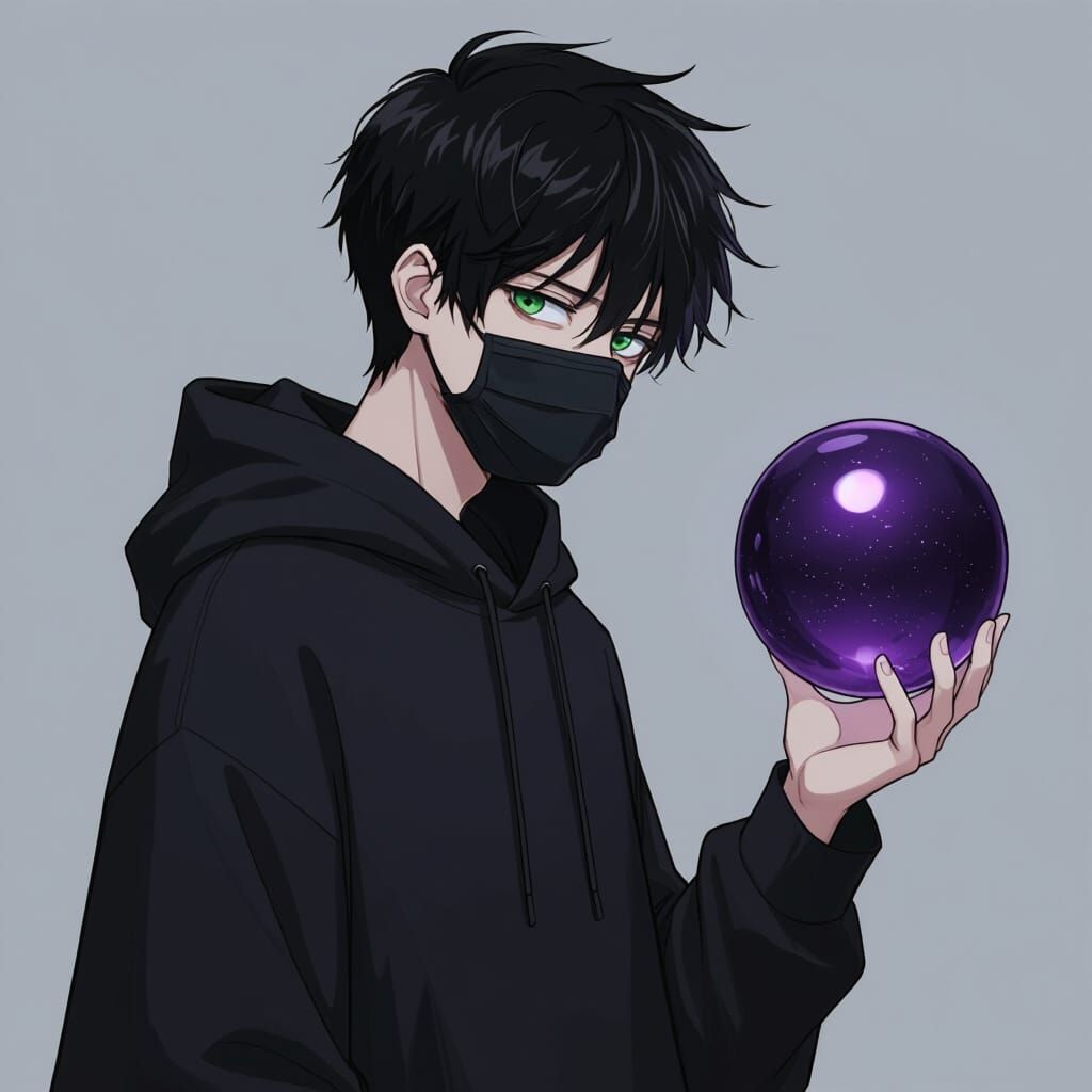 This image shows a tall, slender young man in a black hoodie, holding a translucent purple orb. The image conveys shyness and vulnerability in a dark anime style, with bold lines and muted colors.