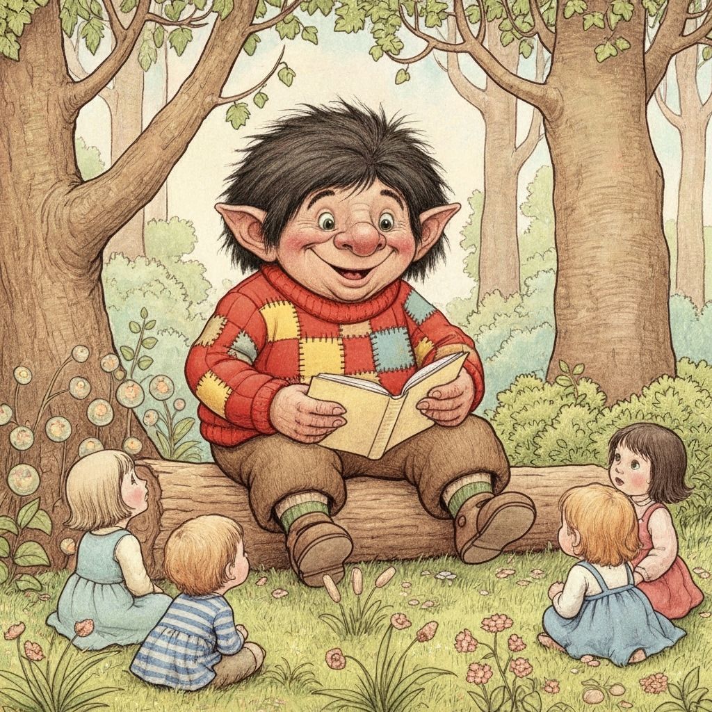 This image shows a friendly troll reading to children in a whimsical forest. The scene is rendered with pastel colors and abstract art elements, reminiscent of classic children's illustrations.