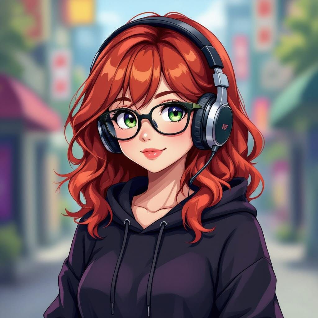 This vibrant anime-style digital art features a female Pokemon trainer with red hair, glasses, and headphones, wearing a purple and black hoodie. The image showcases dynamic lighting and a crisp, cel-shaded aesthetic.
