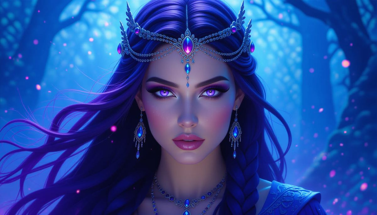 This image shows a sorceress with purple hair and glowing eyes in a neon-lit forest. Digital matte painting with volumetric fog and cinematic lighting creates an ethereal atmosphere.