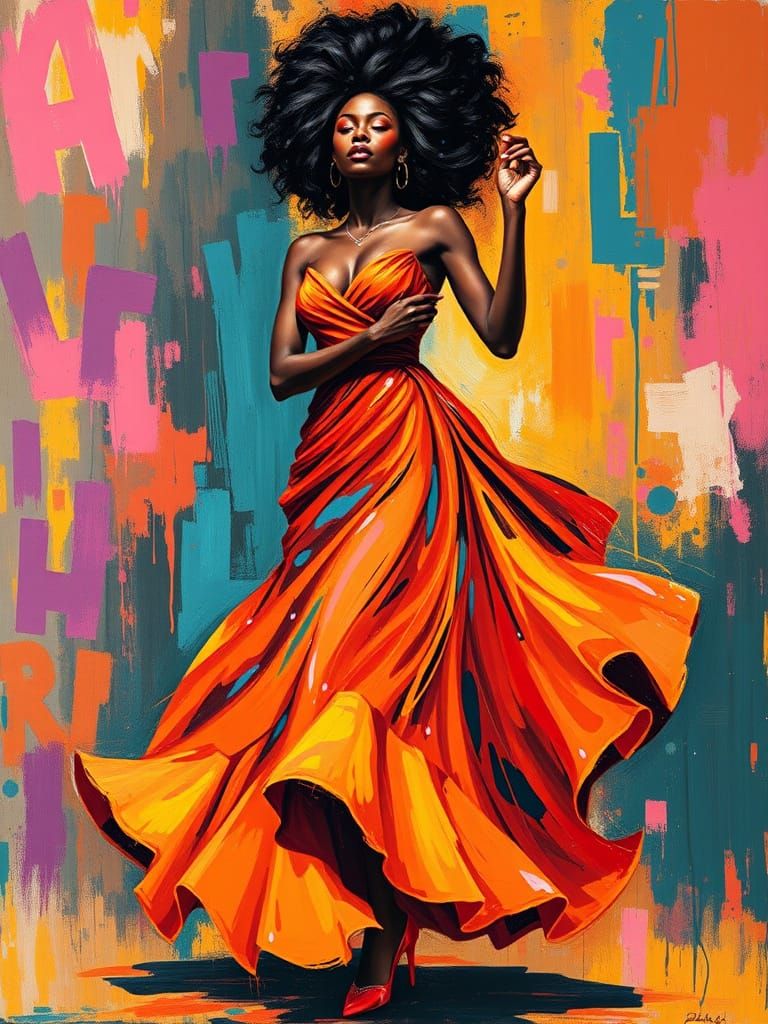 This image shows a Black woman in a vibrant dress dancing to jazz music. The abstract expressionist painting features bold textures reminiscent of contemporary canvas art.