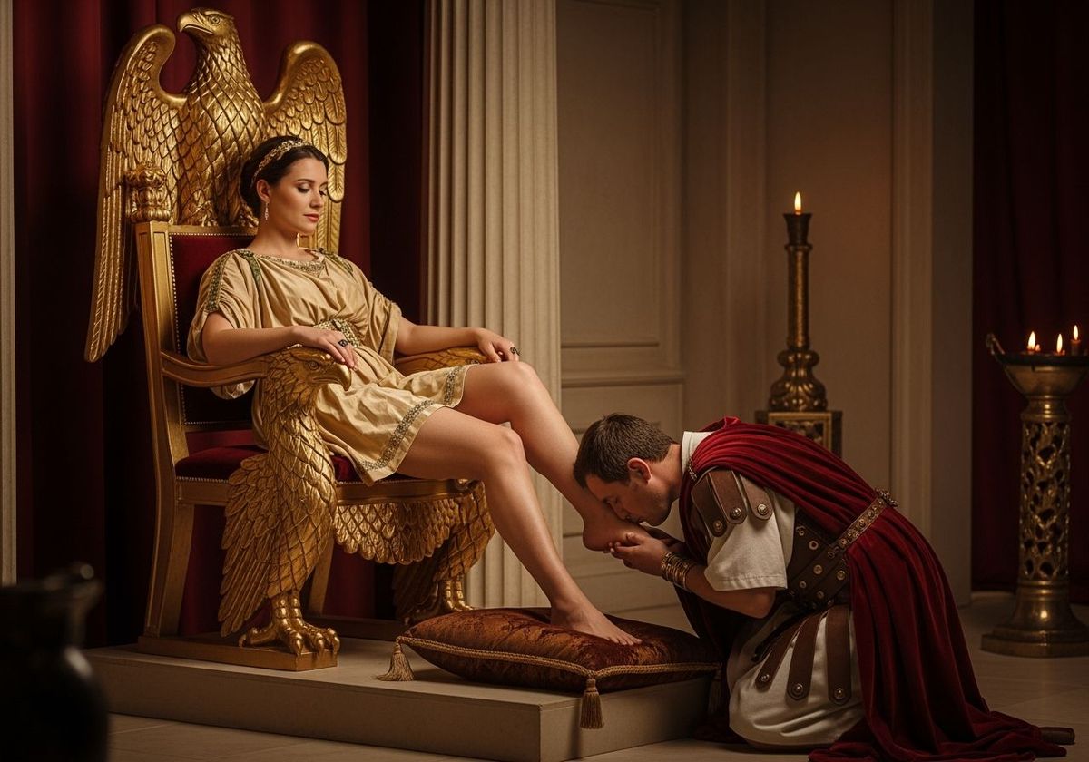 This image shows a Roman Empress reclining on her throne, being waited on by servants. The scene is reminiscent of baroque painting, with natural lighting and sharp focus.