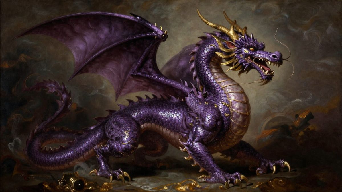 This image showcases a powerful purple dragon with iridescent scales, depicted in a Baroque oil painting style. Dramatic chiaroscuro lighting and ornate details create a theatrical and opulent visual.