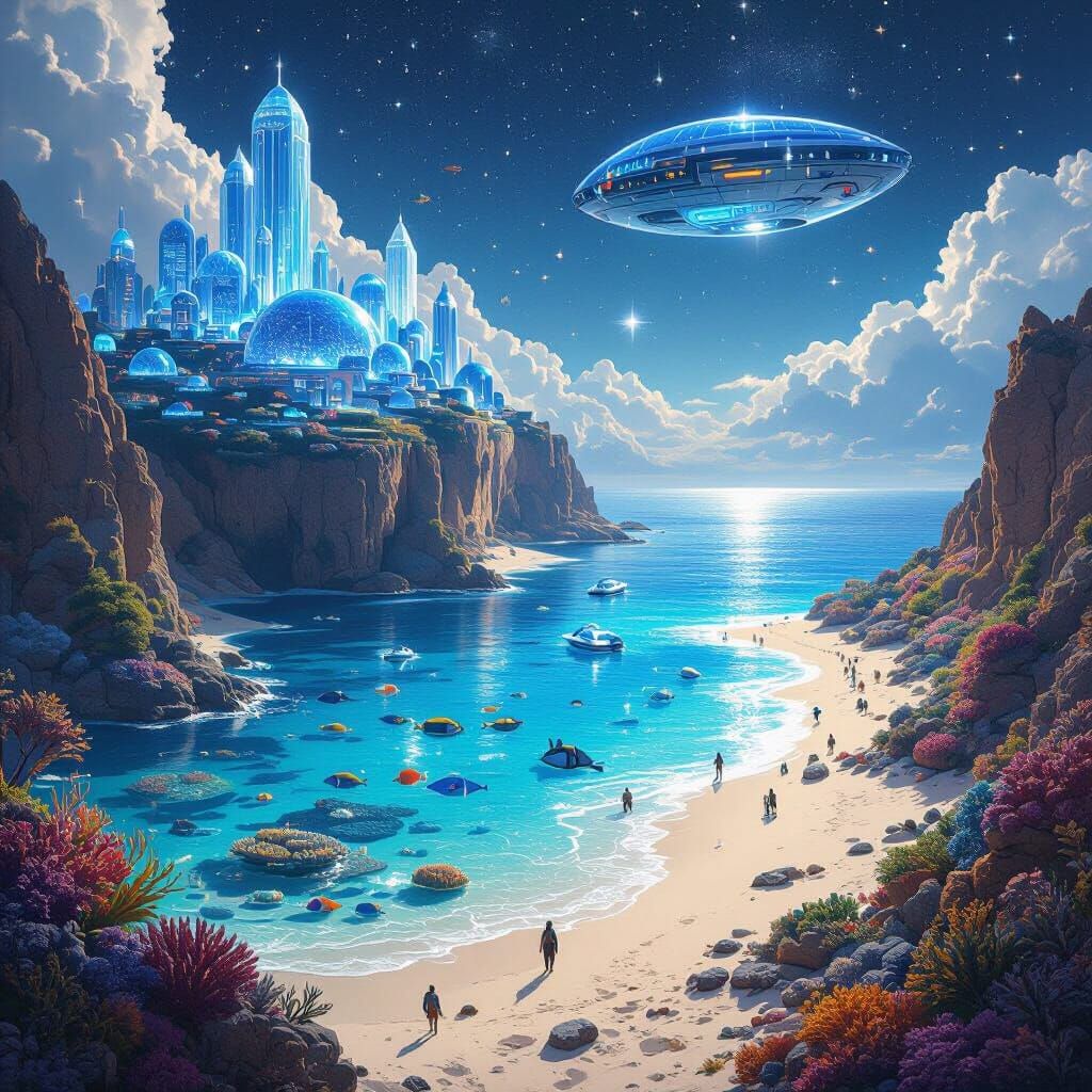 Design unique alien beach landscapes with crystal waters, vibrant corals, and shimmering sands. Free and easy AI image generation.