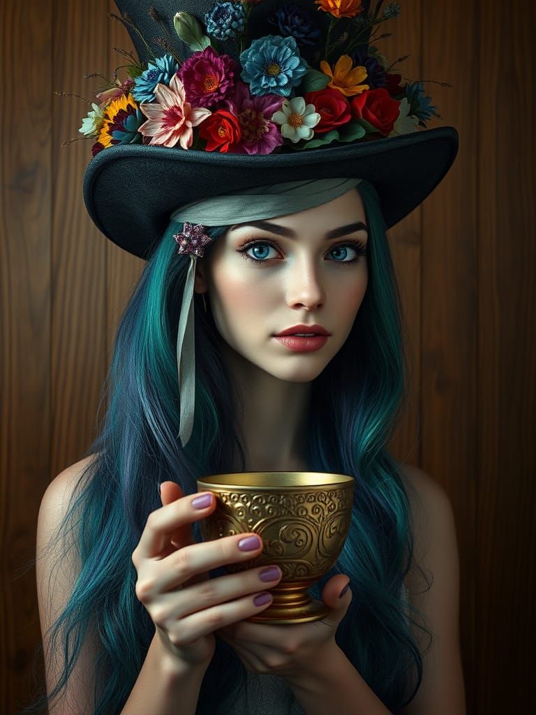 This image features a serene young woman with long, flowing hair in shades of green, blue, and purple, set against a warm, wooden panel background. She wears a large, elaborate top hat adorned with colorful flowers, surrounded by a soft, ethereal glow reminiscent of Art Nouveau and Symbolist styles.