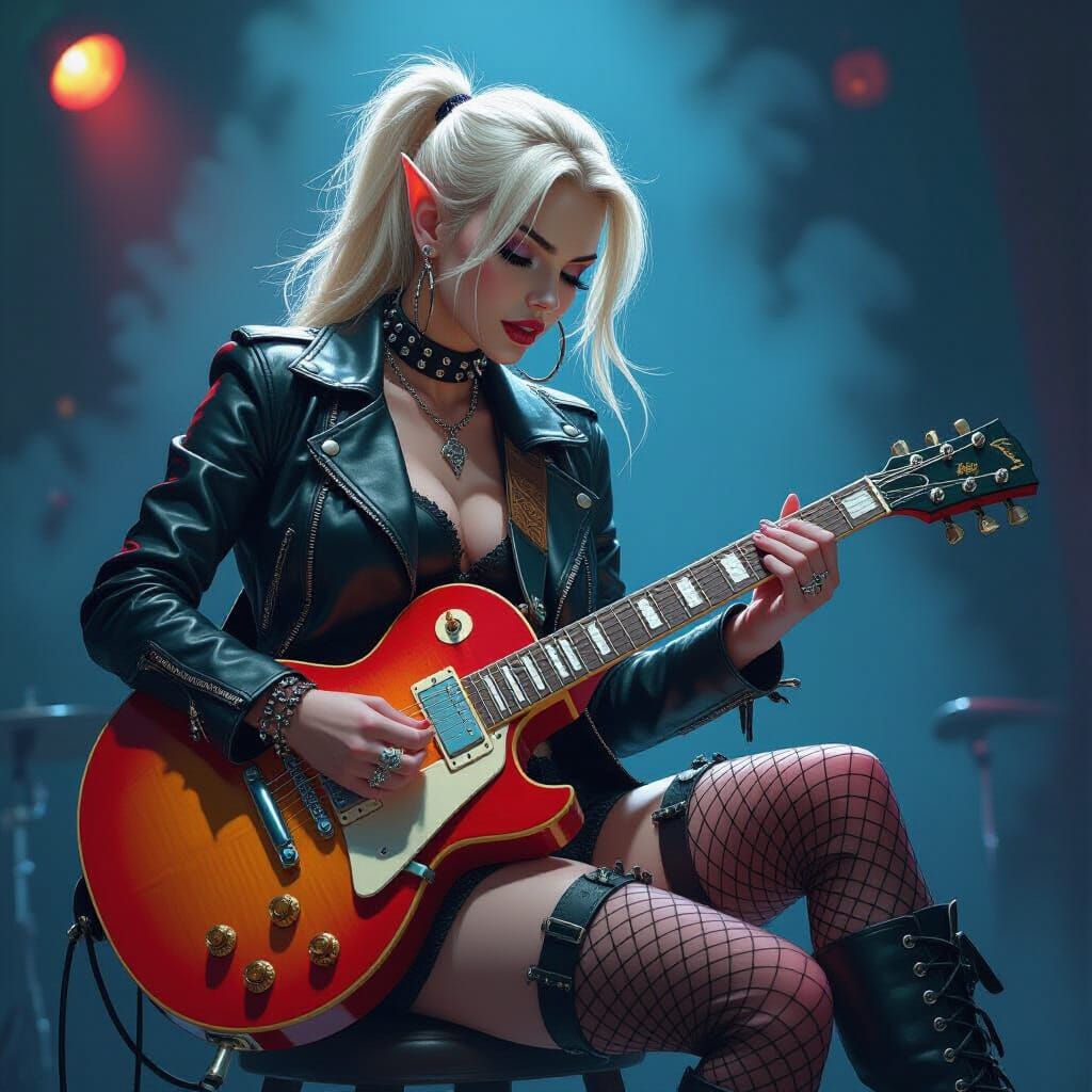 A striking picture of a female elf playing guitar at a concert. She is dressed in punk rock style, with fishnets and a leather jacket, rendered as a hyper-realistic oil painting with bold colors.