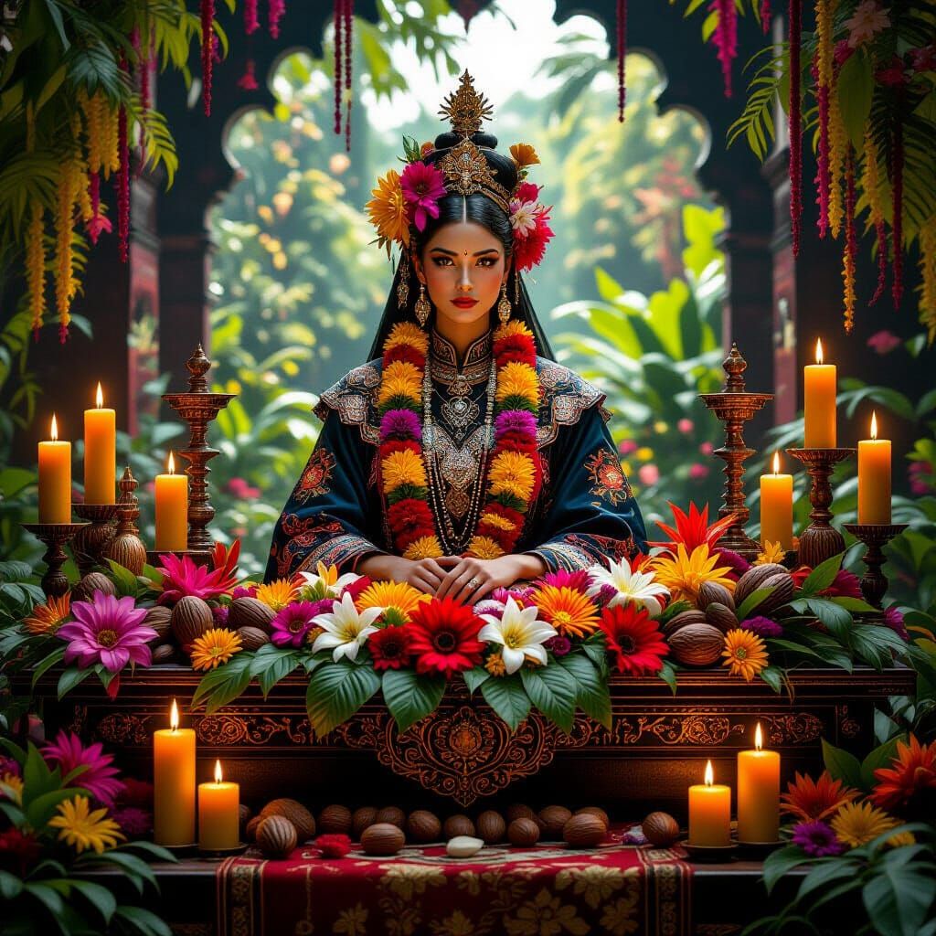 This image showcases an ornate ceremonial altar featuring vibrant flowers, delicate cacao pods, and softly glowing candles, rendered in exquisite photorealistic detail.