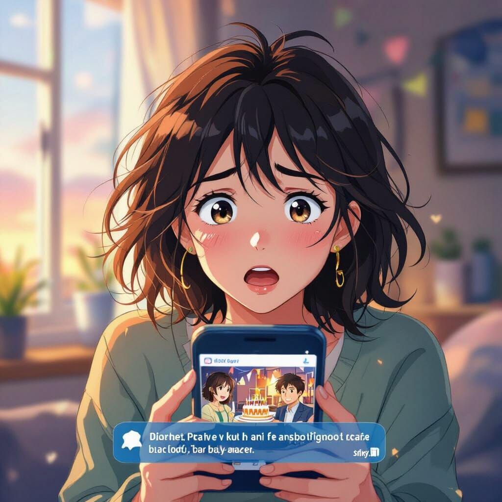 This anime-style image shows a young woman realizing she overslept and missed her friend's birthday, seeing party photos on her phone. The art uses warm oranges and deep blues for emotional impact.