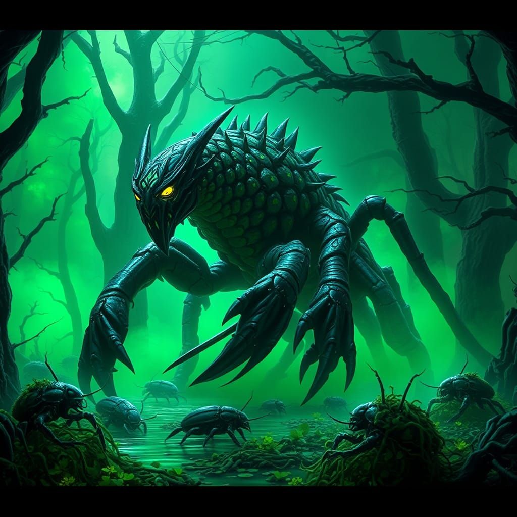 A striking picture of a half-scorpion, half-wolf creature in a glowing green bog. Mecha beetles covered in weeds surround the creature in this dark fantasy concept art, rendered with dynamic lighting.