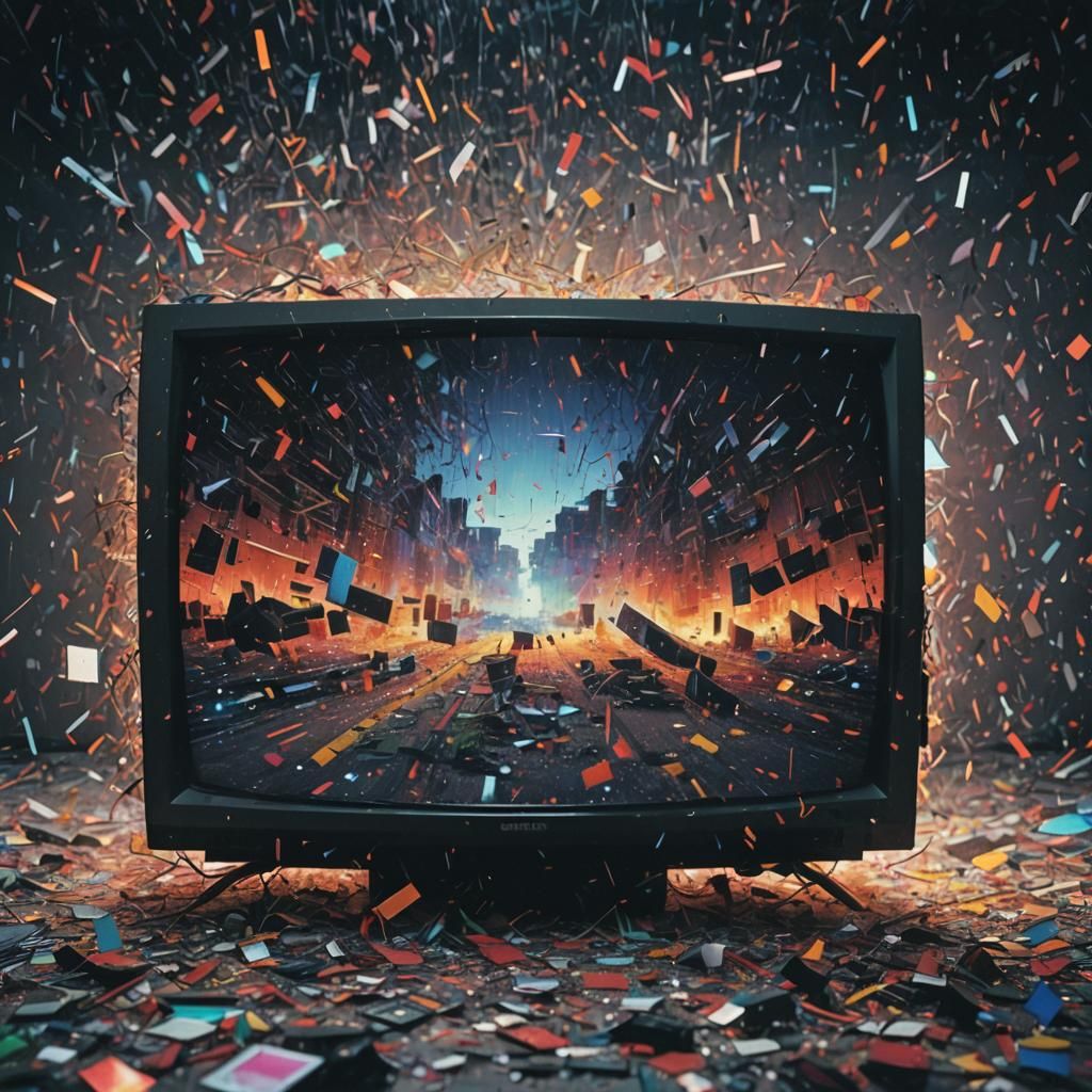 This image shows a large television with a distorted, glitched screen. The effect is a cinematic, film-like disintegration with film grain and dramatic, atmospheric lighting.